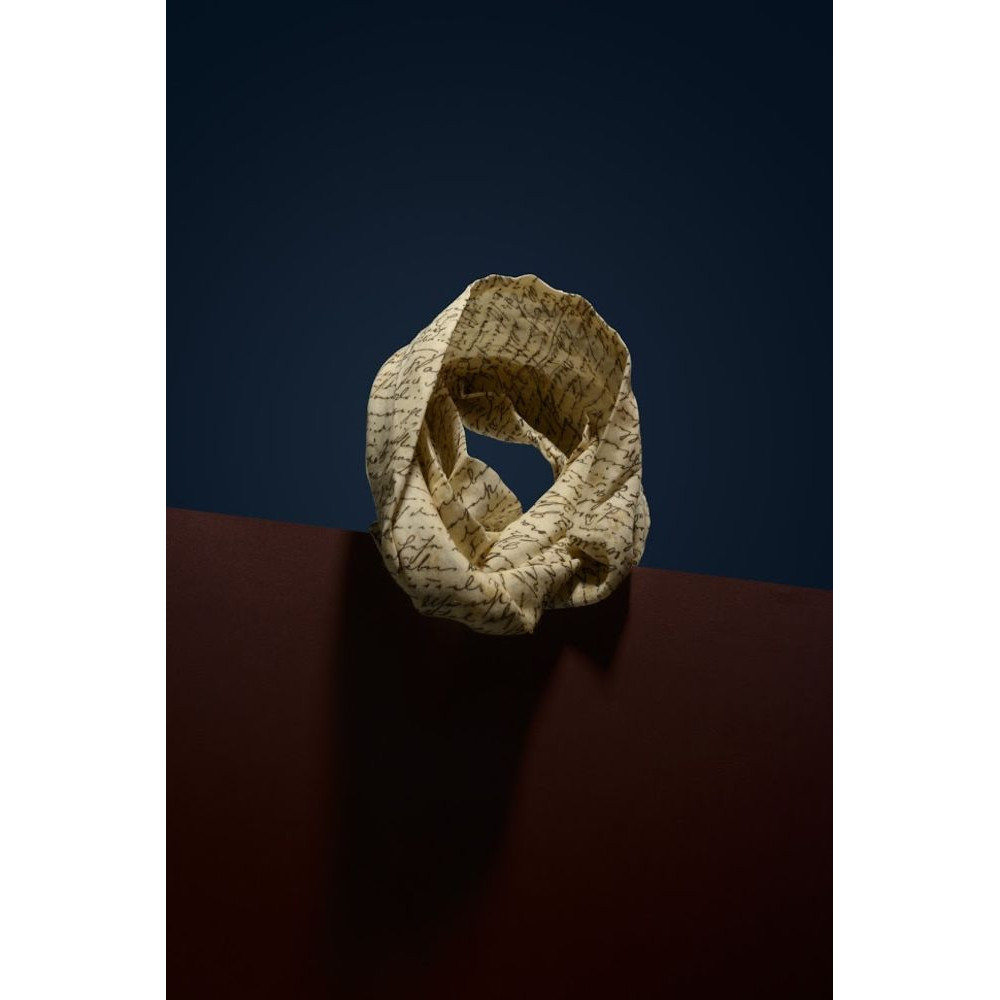 Шарф-снуд сшит по принципу ленты Мебиуса: перекрученное замкнутое кольцо. Именно поэтому он ложится на плечи красивыми складками.